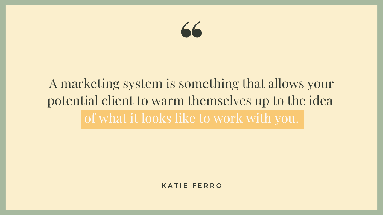 In contrast, a marketing system is something that allows your potential client to warm themselves up to the idea of what it is you offer, what it looks like to work with you, if your offer is something they can afford, if they're ready to take the step to hire someone in the first place, and whether that person they’re going to hire is you.